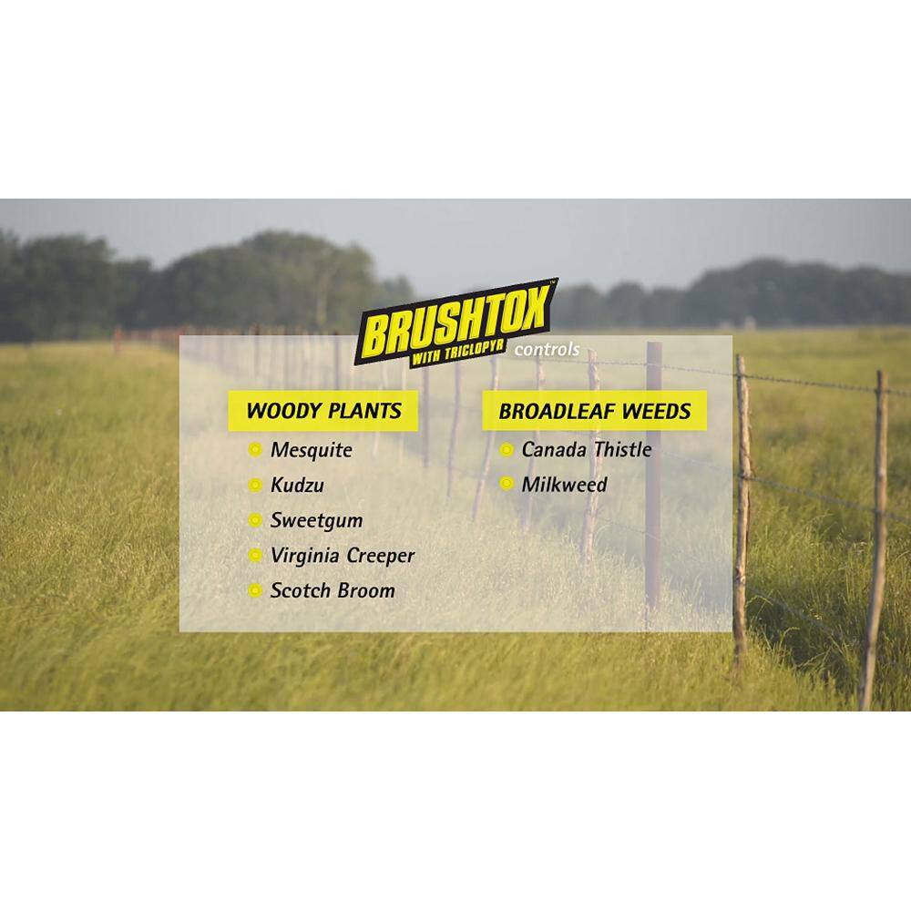 Arm yourself with our newest weapon in the fight against more than 60 woody plants including mesquite, oaks, locust, wild rose and sweetgum and 30 tough broadleaf weeds like Canada thistle and dog fennel. See label for complete list of weeds.Brushtox is a concentrated herbicide that works both economically and effectively on rangeland, permanent grass pastures, fencerows, ditch banks and rights-of-way on acreage large and small. It may be applied to woody or herbaceous broadleaf plants as a foliar spray or as a basal bark (spraying trunk) or cut stump application to woody plants.