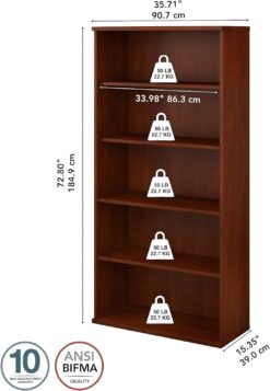 The Bush Business Furniture Studio C 5 Shelf Bookcase looks great, works hard and adjusts to fit the needs of your office. Designed with 2 fixed and 3 adjustable shelves, the tall Bookcase holds your books and reference materials with room for your favorite decorative accents. Store a variety of items on the spacious and durable shelves, designed to hold up to 50 pounds each. A thermally fused laminate finish fends off scratches, stains and dents throughout years of everyday use. Add the coordinating Bookcase Door Kit (sold separately) to conceal the lower shelves for an organized look. The 5 Shelf Bookcase features a classic design but comes in your choice of several contemporary and traditional finishes to fit perfectly in any workspace. Purchase a set of Bookcases to build a complete storage wall that organizes your office and expresses your style. This 5 tier bookshelf is backed by a 10 Year Manufacturer’s Warranty and meets ANSI/BIFMA quality test standards. See the full collection for coordinating items available to make your office your own with Studio C. American made with U.S. and imported parts.