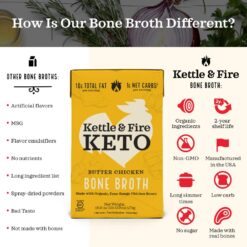 - KETO BONE BROTH: If you love our bone broths and soups, you’ll love our new Kettle and Fire Butter Chicken Keto Bone Broth. Each 16oz carton provides about 2 servings, each serving holding about 6 grams of protein!