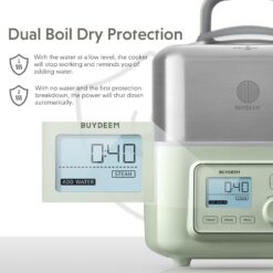 - Auto Power-Off Protection – It has dual protection functions. When the water level is low, the cooker will automatically suspend running and prompt you to add water. When there is no water, the power shut down automatically.