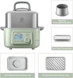 - Timing Function & Easy Operation – This digital steamer produces steam quickly within 1 min., without leaking air or spraying water. It can keep the nutrition and freshness of food while ensuring the cooking speed. The booking starting function is very convenient, pre-programed and you can eat at your desired time.