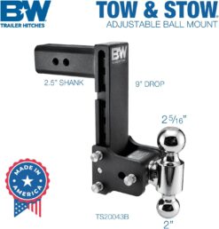 - AMERICAN MADE—The Tow & Stow Adjustable Ball Mount Trailer Hitch is manufactured and assembled completely in Humboldt, Kansas, where we can oversee every detail. B&W’s employee-owners stand behind each product we build and are proud of the Midwest values that have shaped our company into what it is today. We make only the best hitches and towing accessories so that you can focus on the road ahead and never worry about what’s behind.