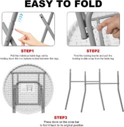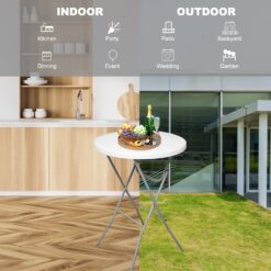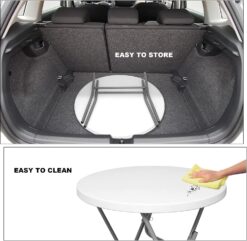 - EASY TO USE: 32 inches tall plastic folding cocktail table, just unfold and lock the legs to keep it strong. Its unfolded size is 31.7″ (Dia) x43.3″ (H). The folded size is 41.3*31.7*1.8 inches, which is convenient for storage. The weight is 17.64 lbs.
