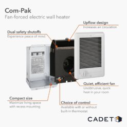 A simple and affordable way to add extra warmth to any living space. The Com-Pak fan-forced in-wall electric heater features a compact size and recess-mount design that requires minimal wall space – ideal for renovations or new construction. This hard-wired electric heater provides quick and efficient heat, yet is quiet enough for any room. Thermostat required for operation; choose a line voltage electronic or programmable wall thermostat or built-in thermostat kit (sold separately).