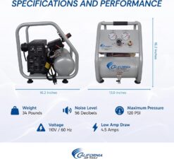 The California Air Tools light and quiet 1P1060SP portable air compressor is designed to be one of the quietest air compressors in the industry at only 56 db of sound. The 1.2 HP motor operates at only 1680 RPM, creating less noise and less wear. The updated in.Ip in. Ultra Quiet and oil-free motor is a single Piston pump design engineered for high performance and durability. The 1.0 GAL. Steel Air tank is lightweight (34 lbs.), making it very easy to transport. This compressor has an oil-free single Piston pump designed to have a life cycle before wear of 3000 Plus hours compared to other comparable air compressors with life cycles of 250 hours or less. The oil-free pump allows for use in a variety of different temperatures (cold) and uneven terrains. The 1P1060SP produces 1.2 CFM at 90 PSI, allowing you to use staple guns, brad nail guns, finish Nail guns, nail guns, airbrushes and blow guns. It’s great for the garage and perfect for cleaning or inflating tires, beds, toys and sport balls. Its quiet design is ideal for anyone working inside where noise is a major issue.