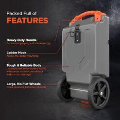 - RV Tote Tank Features: Rhino’s 15-Gallon Tote Tank is equipped with (2) oversized wheels, a large handle, tank rinser, and ladder hook
