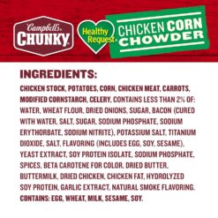 Ingredients: Chicken Stock, Potatoes, Corn, Chicken Meat, Carrots, Modified Cornstarch, Celery, Contains Less Than 2% Of: Water, Wheat Flour, Dried Onions, Sugar, Bacon (Cured With Water, Salt, Sugar, Sodium Phosphate, Sodium Erythorbate, Sodium Nitrite), Potassium Salt, Titanium Dioxide, Salt, Flavoring (Includes Egg, Soy, Sesame), Yeast Extract, Soy Protein Isolate, Sodium Phosphate, Spices, Beta Carotene For Color, Dried Butter, Buttermilk, Dried Chicken, Chicken Fat, Hydrolyzed Soy Protein, Garlic Extract, Natural Smoke Flavoring. Contains: Egg, Wheat, Milk, Sesame, Soy.