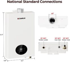 - 【Easy Installation】CAMPLUX CX422 propane water heater complies with national standard and has a UL-approved plug and 1/2 NPT interfaces for both gas and water. Additonal purchase with standard gas regulator and 1/2″ NPT Female to 3/8″ Male adaptor to connects 20 lb propane tank directly. Fits with standard stainless steel 3″ vent pipe
