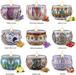 Handmade Candle Sets with Rich Scents: The highly-scented aromatherapy candle sets include 9 kinds of different scents: English toffee, cranberry cloves, lavender, lemon verbena and citrus, teak, saffron and sandalwood, figs and fir, winter moss mahogany, vanilla ice cream.
