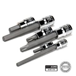 - Includes: (13) external star: 1/4 in. dr: E4, E5, E6, E7, E8, 3/8 in. dr: E10, E12, E14, E16, 1/2 in. dr: E18, E20, E22, E24; (15) star: 1/4 in. dr: T6, T7, T8, T9, T10, T15, T20, T25, T27, T30, 3/8 in. dr.: T40, T45, T50, 1/2 in. dr: T55, T60; (15) long star: 1/4 in. dr. (3-1/16 in. long bit): T6, T7, T8, T9, T10, T15, T20, T25, T27, T30, 3/8 in. dr. (2-3/4 in. long bit): T40, T45, T50, 1/2 in. dr. (2-1/2 in. long bit): T55, T60; (16) hex in metric: 1/4 in. dr: 2, 2.5, 3, 4, 5, 6 mm, 3/8 in. dr.: 6, 7, 8, 9, 10 mm, 1/2 in. dr: 10, 12, 14, 17, 19 mm; (7) long hex in metric: 1/4 in. dr. (3-1/16 in. long bit): 4, 5, 6 mm, 3/8 in. dr. (2-3/4 in. long bit): 7, 8, 9, 10 mm; (15) hex in SAE: 1/4 in. dr: 1/8, 9/64, 5/32, 3/16, 7/32, 1/4 in, 3/8 in. dr: 7/32, 1/4, 5/16, 3/8 in; 7/16, 1/2, 9/16, 5/8, 3/4 in. 1/2 in. dr: 7/16, 1/2, 9/16, 5/8, 3/4 in. (7) long hex in SAE: 1/4 in. dr. (3-1/16 in. long bit): 1/8, 5/32, 3/16 in. 3/8 in. dr. (2-3/4 in. long bit): 7/32, 1/4, 5/16, 3/8 in.