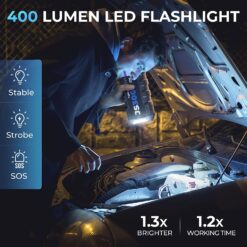 ◉ 3-in-1 Combo ->Not just a car jump starter, JS3000 also serves as a massive 24000mAh backup power bank. The versatile outputs (45W Type-C; 18W QC, 5V/2.1A USB, 16.8V/10A DC) can quickly juice up electronic devices in 1 hour when you need them most: cellphones, laptops, cameras, kindles, GoPros, etc; even some 12V inflators, inverters, or car refrigerators. The integrated 400 lumen LED flashlight can take care of unexpected emergencies at night. It has 3 modes: Steady, SOS, and Strobe.