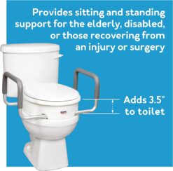 - FITS ELONGATED TOILETS: This elevated toilet seat with arms adds 3 1/2 inches of height to your toilet seat. Provides secure, reliable, elevated fit for standard elongated toilets.Do not use abrasive cleaner on handles. Hinged: No