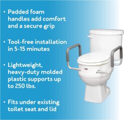 - PADDED HANDLES: Conveniently packed raised toilet seat with removable foam padded support rails which gives you a comfortable, non-slip surface for a secure grip and support when sitting or getting off the toilet.