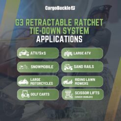 - The CargoBuckle G3 Retractable Ratchet Tie-Down System is the ultimate solution for securing your cargo. With a simple push-button release, you can easily retract and store the straps when not in use. The G3 was built with an anti-corrosive construction and features a dual saftey lock system ensuring a secure load.