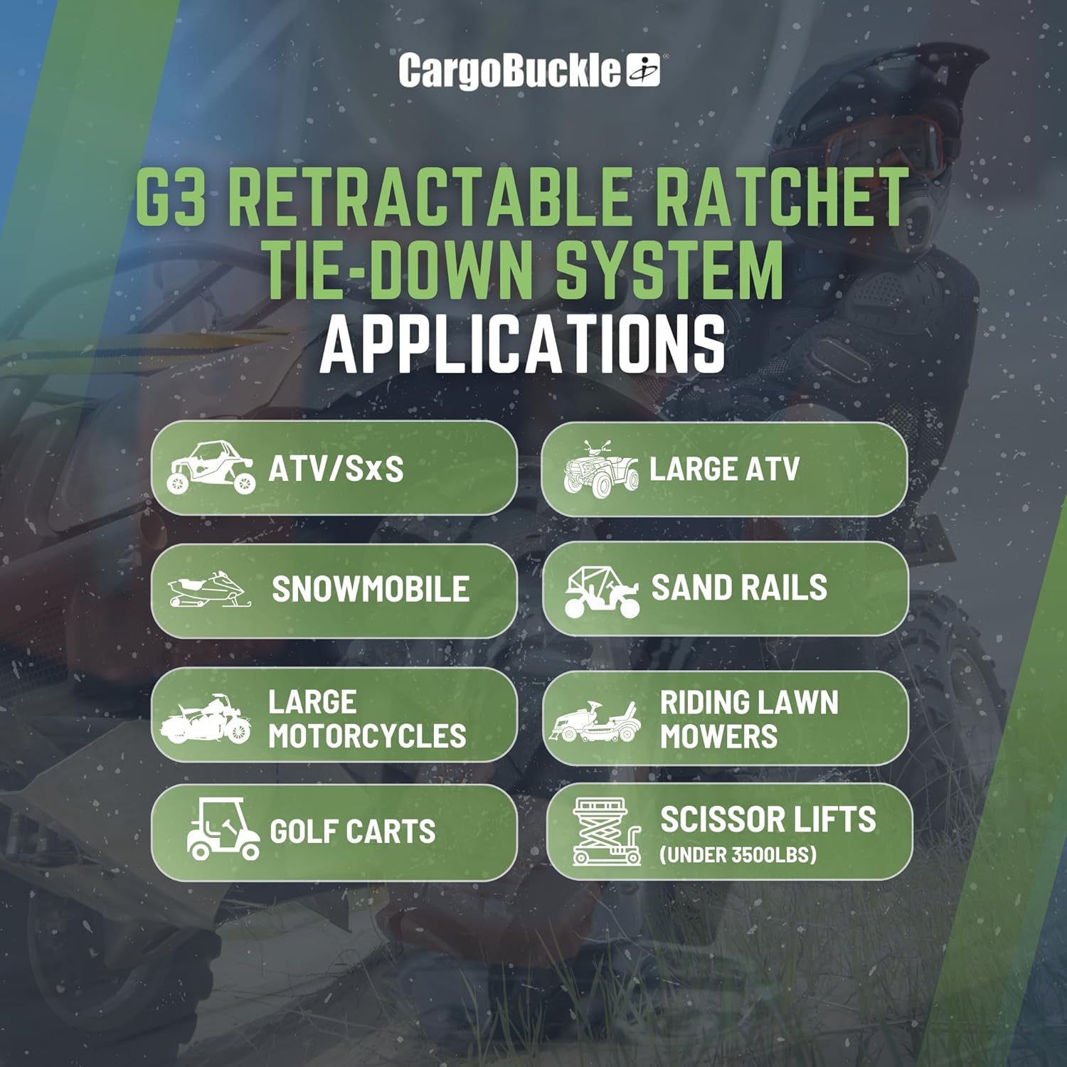 - SECURE YOUR CARGO WITH EASE – The CargoBuckle G3 Retractable Tie Down Straps are the ultimate solution for securing your cargo. With a simple push-button release, you can easily retract and store the straps when not in use. The G3 was built with an anti-corrosive construction and features a dual saftey lock system ensuring a secure load.