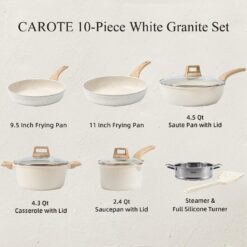 - CAROTE 10-Piece Cookware Set Includes :9.5 inch/11 inch Frying Pan+2.4 QT Saucepan with Lid and steamer+4.3QT Casserole Pot with Lid+4.5QT Saute Pan with Lid+White Silicone Turner. Our favorite non stick pots and pans set meets all your need for every day cooking