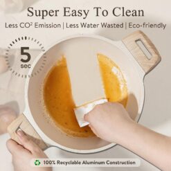 - Easy To Clean – Just wipe it with a paper towel or rinse it with water, Less CO2 emission and Less water wasted.Recommend hand wash the cookware as it is really easy to clean.