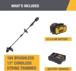 - INCLUDES: 18V 13” Cordless String Trimmer, (1) Safety Guard, (1) Auxiliary Handle, (1) 18V 4.0Ah Battery, (1) 4A Charger