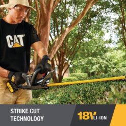 The Cat® DG220 18V Brushless 24” Cordless Hedge Trimmer uses advanced technology and design to enhance power and performance for pro-grade hedge trimming projects. Built with a High-Efficiency Brushless Motor, this cordless hedge trimmer delivers 25% more power, 50% longer run time, and 10X longer life than brushed-motor alternatives. Equipped with 24” Laser-Cut Dual-Action Blades, this cordless hedge trimmer delivers powerful, streamlined, and quick cuts with reduced vibration at a max no-load speed of 3,300 SPM . When the hedge trimmer encounters thick brush or wood that causes a jam, the equipment’s STRIKE CUT Technology will automatically detect the obstruction and temporarily reverse the motor to clear it. This capability promotes smoother cutting and dramatically reduces downtime while trimming. In addition to providing a 24” extended reach, the trimmer blades also deliver a 1” cutting capacity to effortlessly slice through thick twigs and branches. For enhanced peace of mind during operation, the 18V 24” Cordless Hedge Trimmer utilizes a Dual Safety Switch. This feature works by requiring the user to engage two switches to power on the equipment, which in turn, helps prevent accidental starts. While being designed for heavy-duty operation, this 24” cordless hedge trimmer is still easy on the user. The ergonomic body weighs less than 9 lbs. to help minimize fatigue—even during longer periods of use. With the included Adjustable Auxiliary Handle, the trimmer offers expansive maneuverability to make work more efficient and comfortable. Power the hedge trimmer with the included Cat® 1 For All battery and charger. The 1 For ALL battery platform is a rechargeable, interchangeable system that supports all tools within the expansive 18V cordless product line from Cat®. For optimal performance, run time, and protection, choose the 5.0Ah Graphene battery over lithium-ion options.