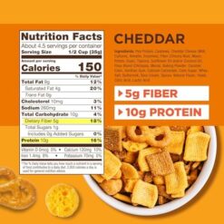Traditional: Pecans, Cashews, Pea Protein, Fiber Blend (Chicory Root, Maize, Potato, Guar), Tapioca, Flour Blend (Chickpea, Maize), Sunflower Oil and/or Coconut Oil, Baking Powder, Caramel Color, Xanthan Gum, Calcium Carbonate, Cane Sugar, Yeast, Salt, Whey, Molasses, Spices, Butter, Milk, Natural Flavor, Vinegar. Cheddar: Pea Protein, Cashews, Cheddar Cheese (Milk, Cultures, Annatto, Enzymes), Fiber Blend (Chicory Root, Maize, Potato, Guar), Tapioca, Sunflower Oil and/or Coconut Oil, Flour Blend (Chickpea, Maize), Baking Powder, Caramel Color, Xanthan Gum, Calcium Carbonate, Cane Sugar, Whey, Salt, Buttermilk, Sour Cream, Spices, Natural Flavor, Yeast, Citric Acid, Lactic Acid. Creamy Ranch: Pecans, Almonds, Pea Protein, Flour Blend (Chickpea, Maize), Fiber Blend (Chicory Root, Maize, Potato, Guar), Tapioca, Sunflower Oil and/or Coconut Oil, Baking Powder, Caramel Color, Xanthan Gum, Calcium Carbonate, Cane Sugar, Salt, Buttermilk, Sour Cream, Natural Flavor, Yeast, Spices, Tomato, Citric Acid, Sweet Cream, Butter, Vinegar, Lactic Acid. Spicy Kick: Cashews, Pea Protein, Cheddar Cheese (Milk, Cultures, Annatto, Enzymes), Fiber Blend (Chicory Root, Maize, Potato, Guar), Tapioca, Sunflower Oil and/or Coconut Oil, Flour Blend (Chickpea, Maize), Baking Powder, Caramel Color, Xanthan Gum, Calcium Carbonate, Cane Sugar, Salt, Whey, Yeast, Citric Acid, Spices, Natural Flavor, Vinegar, Lactic Acid
