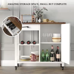 DURABLE AND STURDY KITCHEN ISLAND: Kitchen island on wheels is made of high-quality particle board. Sturdy structure and materials extend the service life. Painted with an effective varnish to keep water away and clean easier. An operating and rolling island for a kitchen suitable for kitchen, dining room, and restaurant.