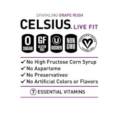 CELSIUS. Live Fit. A uniquely blended formula with healthy energy and key vitamins make CELSIUS an ideal pre-workout drink. It’s low in sodium and contains zero sugar, no aspartame, and no artificial flavors, colors, or preservatives. CELSIUS energy drinks are also Certified Vegan, Kosher, and non-GMO. Its proprietary formula contains green tea extract and EGCG. It also includes guarana seed extract, ginger root for flavor and digestion, vitamin C to support your immune system, vitamin B for energy production, and chromium to help control hunger. Boost your energy and enjoy the refreshing taste of grape with CELSIUS Sparkling Grape Rush Fitness Drink! It’s carbonated and has the perfect balance of flavor and energy that serves as an awesome pick-me-up for active lifestyles. CELSIUS is available in 12 oz. slim cans and sold in a 12-pack for convenience.