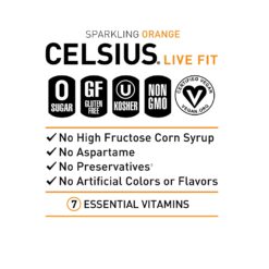 CELSIUS. Live Fit. A uniquely blended formula with healthy energy and key vitamins make CELSIUS an ideal pre-workout drink. It’s low in sodium and contains zero sugar, no aspartame, and no artificial flavors, colors, or preservatives. CELSIUS energy drinks are also Certified Vegan, Kosher, and non-GMO. Its proprietary formula contains green tea extract and EGCG. It also includes guarana seed extract, ginger root for flavor and digestion, vitamin C to support your immune system, vitamin B for energy production, and chromium to help control hunger. Experience orange like never before with CELSIUS Sparkling Orange Fitness Drink! It’s carbonated and has the perfect balance of flavor and energy that serves as an awesome pick-me-up for active lifestyles. CELSIUS is available in 12 oz. slim cans and sold in a 12-pack for convenience.