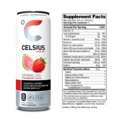 CELSIUS. Live Fit. A uniquely blended formula with healthy energy and key vitamins make CELSIUS an ideal pre-workout drink. It’s low in sodium and contains zero sugar, no aspartame, and no artificial flavors, colors, or preservatives. CELSIUS energy drinks are also Certified Vegan, Kosher, and non-GMO. Its proprietary formula contains green tea extract and EGCG. It also includes guarana seed extract, ginger root for flavor and digestion, vitamin C to support your immune system, vitamin B for energy production, and chromium to help control hunger. Boost your energy and enjoy the delicious combination of strawberry and guava with CELSIUS Sparkling Strawberry Guava Fitness Drink! It’s carbonated and has the perfect balance of flavor and energy that serves as an awesome pick-me-up for active lifestyles. CELSIUS is available in 12 oz. slim cans and sold in a 12-pack for convenience.