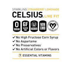 CELSIUS. Live Fit. A uniquely blended formula with healthy energy and key vitamins make CELSIUS an ideal pre-workout drink. It’s low in sodium and contains zero sugar, no aspartame, and no artificial flavors, colors, or preservatives. CELSIUS energy drinks are also Certified Vegan, Kosher, and non-GMO. Its proprietary formula contains green tea extract and EGCG. It also includes guarana seed extract, ginger root for flavor and digestion, vitamin C to support your immune system, vitamin B for energy production, and chromium to help control hunger. Boost your energy and enjoy the delicious combination of fresh Strawberries and refreshing Lemonade with CELSIUS Sparkling Strawberry Lemonade Essential Energy Drink! It’s carbonated and has the perfect balance of flavor and energy that serves as an awesome pick-me-up for active lifestyles. CELSIUS is available in 12 oz. slim cans and sold in a 12-pack for convenience.