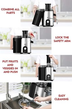 - STABILIZATION AND ANTI-DRIP FUNCTION – Juicer bottom equipped with non-slip rubber feet and allows you to use the juicer safely and more stable. Practical anti-drip spout prevents dripping after extraction and keeps working top clean. In addition, the safety lock arm ensures that the cover remains tight during extraction. The overload protection system will shut off the juicer once overheating.