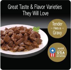 Dogs with sophisticated palates will love the variety of indulgent, rich flavors in the CESAR Adult Soft Wet Dog Food Filets in Gravy Variety Pack, Filet Mignon, New York Strip and Prime Rib Flavors. This culinary-inspired wet dog food is crafted with care to provide your dog with a delicious dinner and balanced nutrition. Made with real beef, it’s packed with meaty goodness. Plus, each flavor is fortified with vitamins and minerals to help dogs of all sizes feel paw-sitively great. You can serve it on its own, or add it as a delectable meal topper––either way, your dog will delight in this dish!