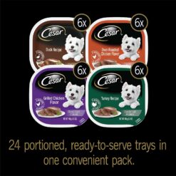 - Contains one (1) 24 count case of 3.5 ounce easy peel trays of Cesar Wet Dog Food Poultry Variety Pack: (6) Duck Recipe, (6) Grilled Chicken Flavor, (6) Oven Roasted, Chicken Flavor, (6) Turkey Recipe