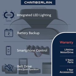 Chamberlain B6713T 1-1/4 HPS myQ Smart Compatible Belt drivec Wi-Fi Compatibility and Battery Back-Up LED Light