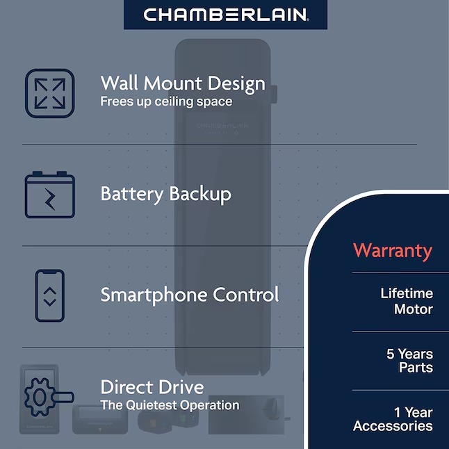 Chamberlain RJO101 myQ Wall Mount Smart Compatible Direct drive Garage Door Opener Wi-Fi Compatibility and Battery Back-Up LED Light