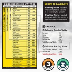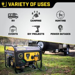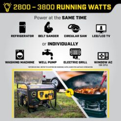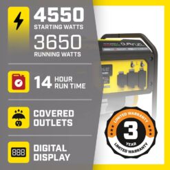 - 4550-Watt starting watts and 3650-Watt running watts on gasoline and 4100-Watt starting watts and 3285-Watt running watts on propane, trust volt guard built-in surge protector prevents overloads and keeps your appliances and equipment safe