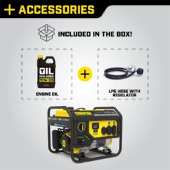 - Operate your 3650-Watt portable generator right out of the box on either gasoline or propane, plus the unit holds 0.6 Qt. of oil (included) and has a low oil shut-off switch