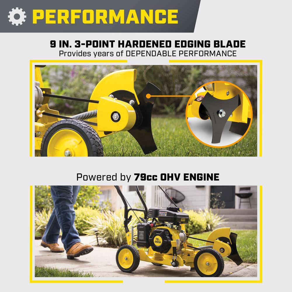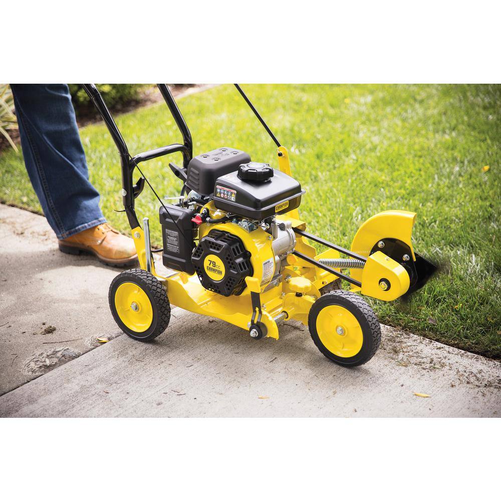 The Champion Power Equipment 201465 9 in. Lawn Edger combines power and performance perfectly, taking your property from overgrown to professionally edged in no time. The 79CC, 4-stroke OHV engine powers the 9 in. heavy-duty carbon steel blade as it tackles tough overgrowth. The depth adjustment includes 5 cutting depth settings from approximately ground level to 2.5 in. (63 mm) deep allowing you to choose the depth of edge you need. The blade bevel angle adjustment makes this capable edger the perfect match for anyone who wants to create decorative edging along beds of mulch or flower beds. Champion’s compact and efficient design includes a conveniently located control lever, contoured to fit the soft grip ergonomic handle, allowing you to work at a comfortable and consistent pace. The 7 in. never flat wheels give you maximum mobility around your yard, allowing you to transport your edger across driveways and sidewalks with ease. Uncover and define your hard surfaces and give your lawn a clean, manicured look with Champion’s 9 in. lawn edger. This unit holds 0.37 Gal. of gasoline, has a 0.4 qt. oil capacity and includes 10W-30 engine oil, an oil funnel and a spark plug socket. This edger is EPA certified. Buy with confidence-Champion Support and our nationwide network of service centers will back your purchase up with a 2-year limited warranty and FREE lifetime technical support.