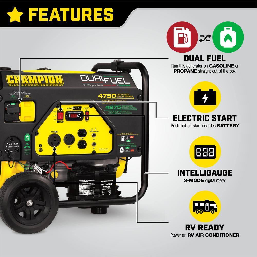 Champion Power Equipment 76533 3800-Watt/4750-Watt Electric Start Gas and Propane Powered Dual Fuel Portable Generator