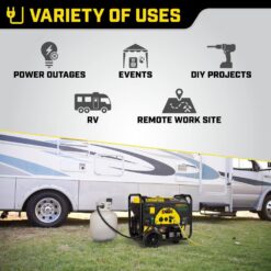 The Champion Power Equipment 76533 3800-Watt Dual Fuel RV Ready Portable Generator is the perfect combination of versatility and convenience. With enough power to start and run a 15,000 BTU RV air conditioner, this unit can also power the essential items you need in a power outage. The convenient electric start Includes a battery, plus Cold Start Technology ensures a quick start in cold weather. Operate your Dual-Fuel generator right out of the box on gasoline or propane – our patented fuel selector switch allows for safe switching between fuel sources. Using gasoline, the 224 cc Champion engine produces 4750 starting Watt and 3800 running Watt and will run for 9-hours at 50% load when the 3.4 Gal. fuel tank is full. Noise level is 68 dBA from 23 ft., which is about as loud as a vacuum. Volt Guard is a built-in surge protector which prevents overloads and keeps your equipment safe. Interlanguage, which allows you to keep track of voltage, hertz and run-time hours. Designed with a low oil shut-off sensor, this unit has a 0.6 Qt. oil capacity (included 10-Watt to 30-Watt). Plenty of outlets are available, with a 120-Volt 30 Amp RV (TT-30R), a 120-Volt 30 Amp locking outlet (L5-30R) and two 120-Volt 20 Amp household outlets (5-20R). Champion Support and our nationwide network of service centers will back up your purchase with a 3-year limited warranty and free lifetime technical support.