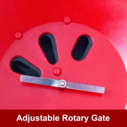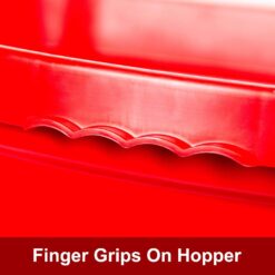 - 80-POUND CAPACITY HOPPER: weather and rust-resistant, red, 1-piece poly is supported on a stainless-steel frame; enclosed gearbox products it from weather and a grease fitting minimizes friction; rain cover and hopper grate are included