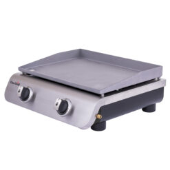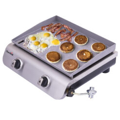 Enjoy grilled food anywhere at anytime with the Char-Broil® 2-Burner Tabletop Griddle. It’s equipped with two burners for zonal cooking that allows you to grill food on each side of the griddle at different temperatures. The compact size and integrated handles make it easy to pack-up and go, while adjustable legs let you grill-it-up despite uneven surfaces. The side grease-cup securely locks in place, making travel and clean-up easier than ever before.