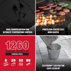 - CAST IRON GRATES TO LOCK IN FOOD FLAVOR Includes durable porcelain-coated cast iron cooking grates to seal in authentic bbq charcoal flavor.