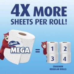 Mega-roll bathroom tissue offers Ultra Strong innovation for superior cleaning. Charmin Ultra Strong is woven like a washcloth and cleans better than the leading bargain brand. Deeper texture of the two-ply tissue delivers a better clean. Omnidirectional strength makes the tissue stronger for better hand protection. It is four times stronger when wet than the leading bargain brand so you can use less. Optimized softness allows comfort at the higher wiping pressure. When you buy Charmin Ultra Strong Mega Roll toilet paper, you get a long-lasting roll because one Charmin Mega Roll equals four regular rolls. Tissue is clog-safe and septic-safe.