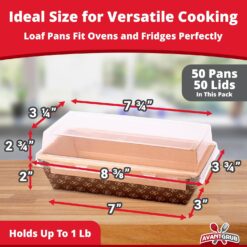 Chef-Grade 8x4in 1Lb Paper Loaf Pans w/Lids 50Pk. Elegant Disposable, Bakeable Kraft Pan Supplies for Baking Bread, Small Meatloaf, Bundt Cake Sweets for Holiday Gifts, Bake Sales or Fundraiser.