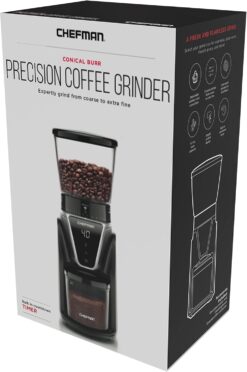 Chefman Conical Burr Coffee Grinder, Create The Boldest & Most Flavorful Grind With 31 Settings From Coarse To Extra Fine, One-Touch Digital Control & 9.7-oz Bean Capacity, Black