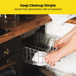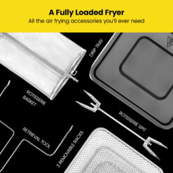 - ACCESSORIES INCLUDED: 3 air flow racks, stainless steel rotisserie spit and forks, rotisserie retrieval tool, and removable drip tray are dishwasher-safe for easier clean up.