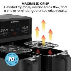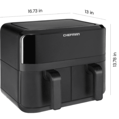 Chefman just made family mealtime faster, tastier, and easier than ever. No matter the crowd, the Turbo Fry Touch Dual Air Fryer has you completely covered. Two spacious 4.5 quart non-stick baskets, allows you to cook double the dishes–with double the flavor. With synced baskets and a handy finish-time feature, every single main dish and side will be cooked to crispy perfection. With effortless one-touch digital control and eight built-in cooking functions, you can cook your favorite foods to the perfect fried finish, every time. No matter if you’re in the mood for crispy chicken, a medium-rare ribeye, or golden fries, this appliance helps you cook with complete confidence. The adjustable temperature of 200°F to 400°F and the ability to add or subtract time allow you to tailor your air frying. Worried about overcooking? An LED reminder tells you exactly when it’s time to give your food a shake to ensure even cooking, every time. The air fryer also features auto-shutoff to avoid overheating and to keep you and your family 100% protected. The matte black exterior wipes down simply with a damp cloth, and the accessories can be tossed right in the dishwasher. 1500 watts/120 volts – RJ38-SQPF-45TDB