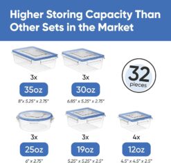 - Variety Of Sizes: These airtight storage containers come in practical shapes and sizes to meet all your needs. You’ll receive (3) 35oz rectangular containers [4.4 cups], (3) 30oz rectangular containers [3.8 cups], (3) 25oz round containers [3.1 cups], (3) 19oz rectangular containers [2.4 cups], and (4) 12oz rectangular containers [1.5 cups]