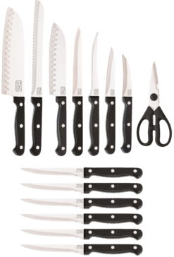 - ALL IN ONE: Essentials 15-piece set includes 3-inch peeling, 3-1/2-inch paring, 4-1/2-inch serrated fruit, 4-3/4-inch serrated utility, 5-inch Santoku, 7-inch Santoku, 8-inch scallopped bread knives, shears, six serrated steak knives, and wood block