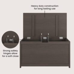 - Safety-Hinges: This toy bin has two safety hinges that allow for a soft close when shutting the lid to help protect little fingers, along with a cutout beneath the lid. A standard ventilation hole is located on the back of the box for added safety measures.